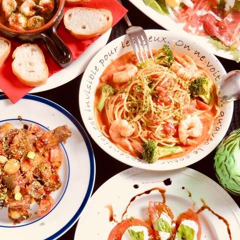 前菜からデザートまで、旬の食材を使った自慢のコース料理。人気のアヒージョやピッツァ、ひな鳥のディアボロなど、当日の味をしっかり楽しめる内容になっています♪☆記念日や女子会、仲間との食事会にもぴったりです、♪☆
