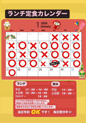 ランチ営業は11時から16時(ラストオーダー15時)赤マル日のみ営業中。席予約は受付しておりません。