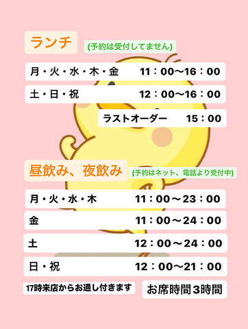 月~木: 11:00~23:00 金: 11:00~翌0:00 土、祝前日: 12:00~翌0:00 日: 12:00~21:00 21:00以降のご予約をご希望の場合はお電話にてご相談ください。 |