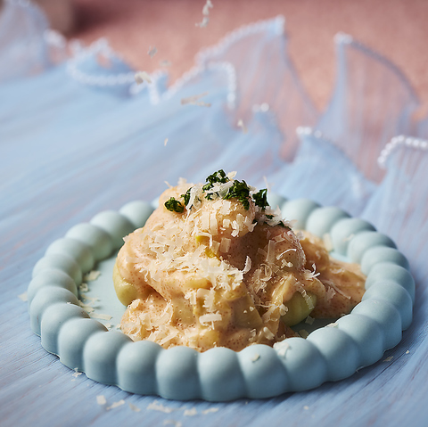 カウンター越しにシェフが目の前で調理するライブキッチンでは、朝・昼・夜それぞれ異なったお料理をご用意しております!目でも香りでも楽しめる贅沢なライブキッチンには、お肉やお魚、パスタなど。写真は、出来立て「じゃがいものニョッキ 明太子クリームソース」
