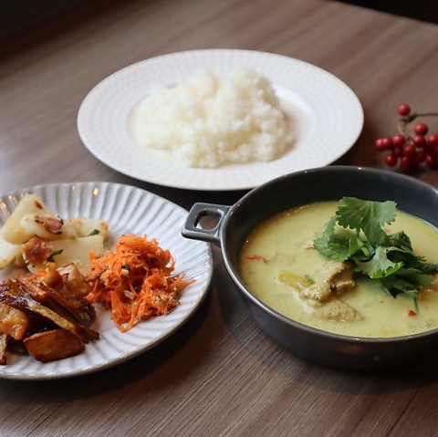 ほんのり辛い当店オリジナルタイカレー。リピーター続出のオリジナルタイカレー。初めての方にも食べやすい味です。手作りのおそうざい(2~3品)もお楽しみ下さい。