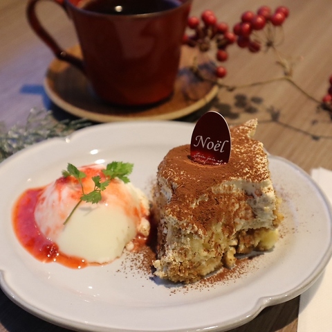 食後にちょうどいい♪リベール特製スイーツです。2025年クリスマスデザートとして、大人気ティラミス&いちごソースのミルクプリンをご用意しています。