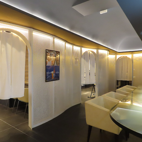 カウンター席はお仕事帰りのお食事や、気軽に飲みたいときにぴったり。間隔が広くゆったりした造りなので、落ち着いた空間でお食事やお酒を愉しんでいただけます。