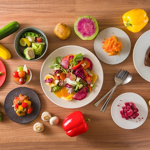 その日、入荷した彩り豊かな新鮮野菜。生野菜やグリルなど野菜たちにあう調理法で素材本来の味わいを引き出した10種類以上の野菜をお楽しみください。