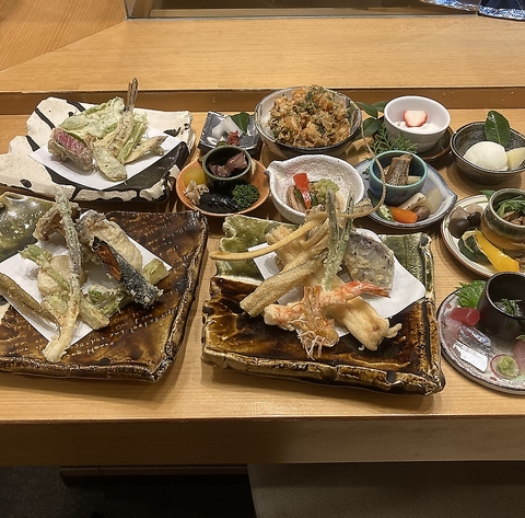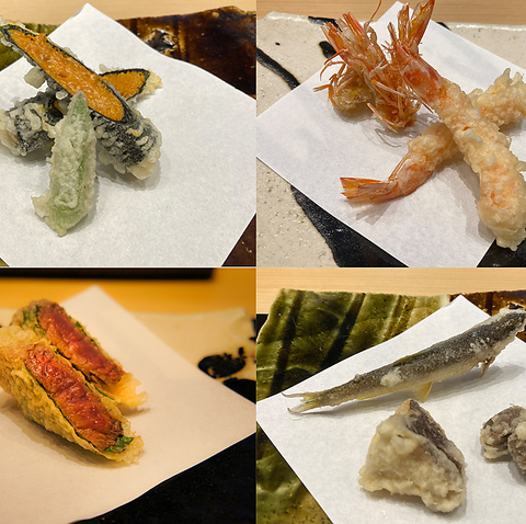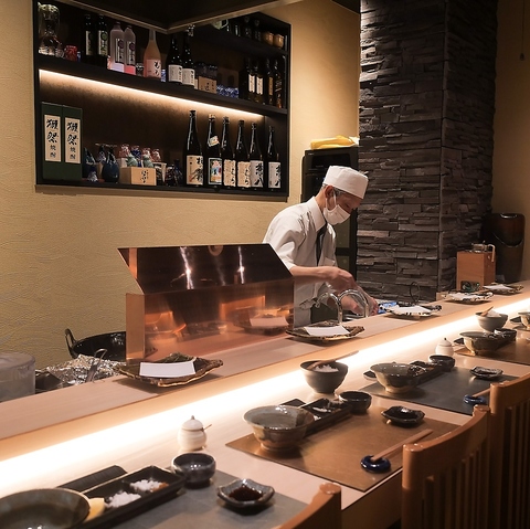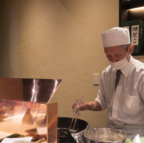【目の前で職人技を楽しめる】お席の目の前では、手際よく料理を作っていく様子が伺えます。天ぷら専用IHフライヤーを使っているため、熱さややけどの心配はありません。味わいだけでなく、調理の香りや音に心を添わせ、五感を研ぎ澄ませながらお食事をお楽しみください。≪和食/春日/天ぷら/貸切/接待/デート/記念日≫