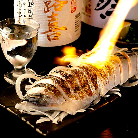 脂がのった〆鯖は、日本酒との相性も抜群◎お客様の目の前で炙りますので迫力も満点です!また、鯖と日本酒の組み合わせはうまみの相乗効果が起こる黄金コンビ☆当店では鯖専用日本酒もご用意しておりますので、ぜひご一緒にお楽しみください!