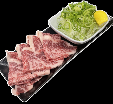 A5ランクしまね和牛の美味しい食べ方新提案。脂のたっぷりのったカルビはネギとレモンにベストマッチ。先にカルビを焼いてから、ネギをのせ、レモンを絞ってどうぞ。