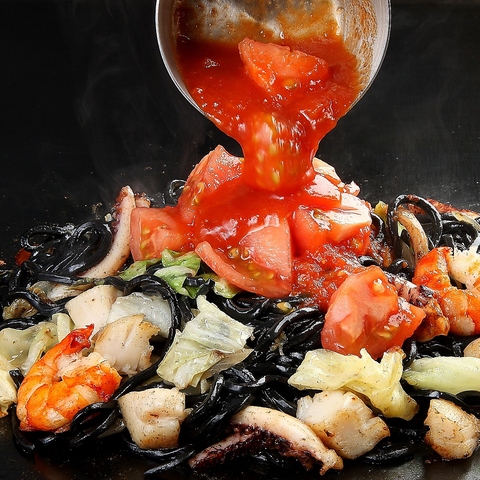 真っ黒な麺に鮮やかなトマトソースがかかった、目にも鮮やかなインパクトある一品。旨みの強い塩味(ソース味バージョンもあり)で炒めた竹炭そばに、酸味の効いたトマトソースが織りなす絶妙なハーモニーは、奇跡のコラボ。さらに、竹炭は、豊富なミネラルを含む素材で、健康や美容にもいい★是非一度ご賞味あれ♪