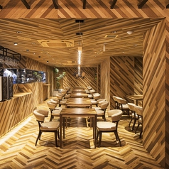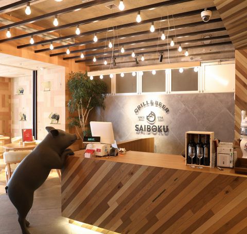 サイボクの自社牧場の銘柄豚「ゴールデンポーク」を取り入れたデザインのインテリア。 落ち着いていてお洒落な内装◎
