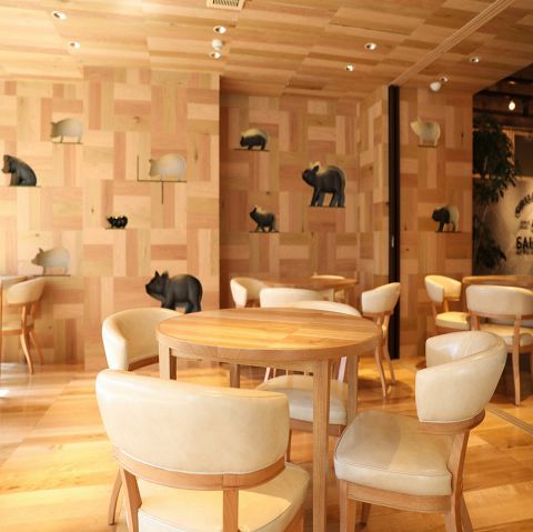 ≪憩いのひとときを≫ 木のぬくもりを感じられる落ちついた空間。 SAIBOKUの銘柄豚「ゴールデンポーク」をデザインに織り込んだ、お洒落な内装◎ 店内は全席禁煙。ベービーカーをご利用でのご来店もOK! お子様連れでのママ友会や女子会、ご家族揃ってのお食事も大歓迎です。 ご家族、ご友人との語らいのお席に。