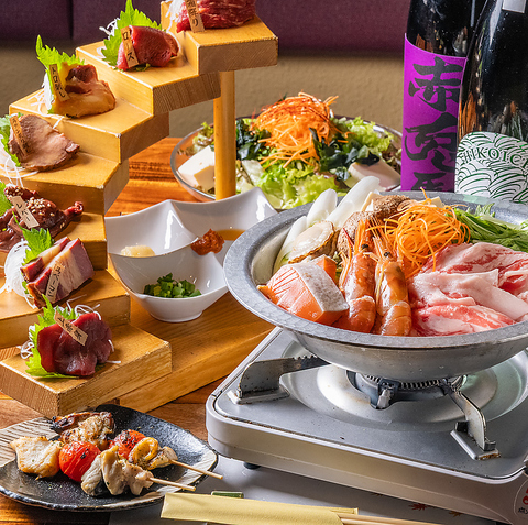 【少し贅沢な飲み会に最適】名物の馬刺しの階段盛りや宴会料理にしか登場しない当店オススメの茨城県産豚肉と海鮮の寄せ鍋。〆は海鮮と豚肉の効いた出汁のうどん。質と量も大満足のコースになっています!通常飲み放題に銘柄日本酒が5種・ハイボールが3種やビールが3種、カクテルが2種、果実酒が2種、焼酎が4種追加で味わえるプレミアム飲み放題がたっぷり2時間飲み放題!