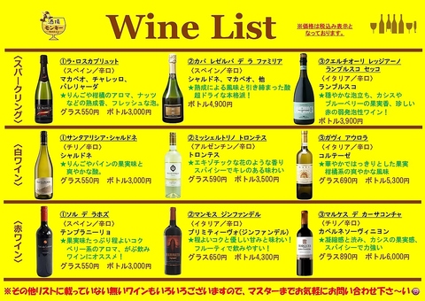 2時間飲み放題メニュー※おかわりはグラス交換でお願いいたします!飲み残しはないようご協力をお願いいたします!※乾杯用スパークリングワイン(お1人様1杯サービス!!)