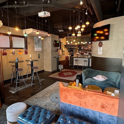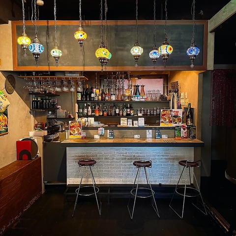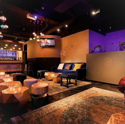 当店の1つ下のフロアは、ゆったりとおくつろぎいただけるバーになっております。カラフルなトルコランプと広々ソファーで大人の時間をお過ごしください。シーシャも充実しており、お酒と一緒にチルな時間を演出します。