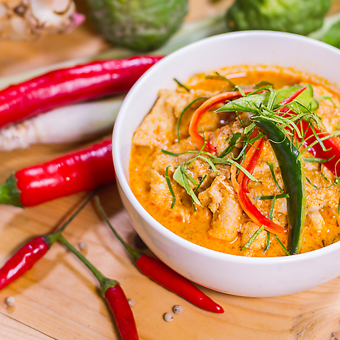 レッドカレーペーストの奥深い辛味にあみを発酵させたカピ、ナムプリックパオ、ココナッツミルク、食べた事のない調味料ばかりを使用したタイのカレー拉麺ですが、一度食べたら病みつきリピーター様続出の大人気メニューです!残ったスープにジャスミンライスを入れて食べても最高です!一度に二度美味い逸品です!
