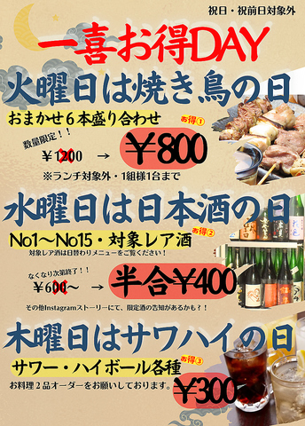 【一喜お得DAY】水曜日は日本酒、木曜日はサワ―・ハイボールがお得♪