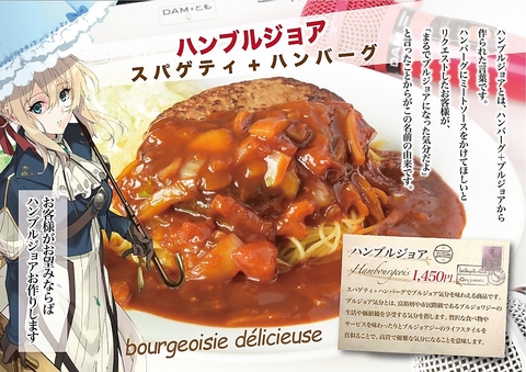 「お客様がお望みならば ハンブルジョアお作りします」ハンブルジョアとは、ハンバーグ+ブルジョアから作られた言葉です。 ハンバーグにミートソースをかけてほしいとリクエストしたお客様が、 「まるでブルジョアになった気分だよ」と言ったことからこの名前の由来です。