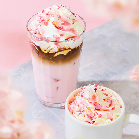 ピンク色のさくらいちごミルクにエスプレッソを注ぎ入れた、ビターな甘さが特徴のバランスが取れた味わいです。トッピングのサクラクランチの食感がアクセント。