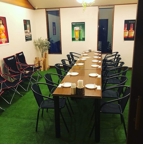 人口芝の床でアウトドア気分に♪2Fフロア,着席時36名様,立食時60名様で貸切可能となっております!会社仲間やサークル・スポ少などのご利用にぴったりです。仕切りなどもございますので10名様など人数に関してもお気軽にご相談ください!各宴会や用途に合わせたコースも多数ご用意しておりますので、是非ご利用ください!