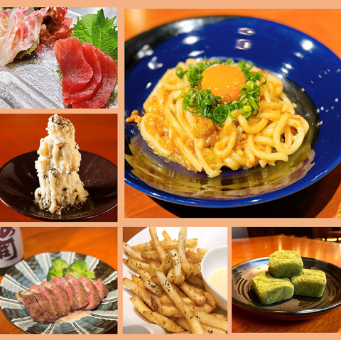 旬の食材を使った季節メニュー、鮮魚、アヒージョ、生ハム、お肉、酒肴からデザートまで、豊富なメニュー