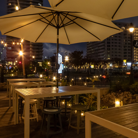 お昼はビアガーデン風の雰囲気が漂い、夜は異国情緒な雰囲気でお食事楽しめるテラス席。ぜひご利用ください!