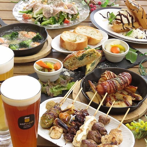 ホップスタンドが初めての方におすすめ!イチオシの「鶏ロースの焼き鳥」やビールに合う「カリーブルスト」など人気商品盛りだくさんの【ホップスタンドおすすめコース】忘年会などでのご利用も◎