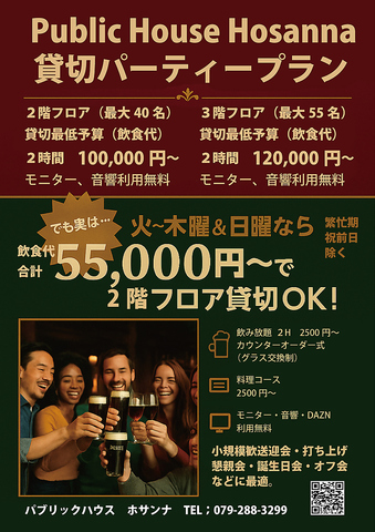 2次会や3次会にピッタリのPartyコースは計4品1000円(税込)~、当店人気メニューや英国の伝統料理が楽しめるPartyコースもございます。飲放のドリンクは、ソフトドリンクやノンアルコールカクテルが15種類以上!ノンアルコールビールもございますので、お酒を飲めない方もお楽しみいただけます♪ぜひ女子会や二次会にも最適な「ホサンナ」へ
