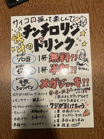 出た目が…ゾロ目:1杯無料!!、偶数1杯半額!!、偶数orションベン:メガジョッキ※価格はメガ料金となります。<ドリンク>デュワーズハイボール/ウーロンハイ/レモンサワー/緑茶ハイ/グレープフルーツサワー/ジャスミンハイ/ラムハイ/無糖紅茶ハイ/氷彩サワー/巨峰サワー/男梅サワー/ライチサワー