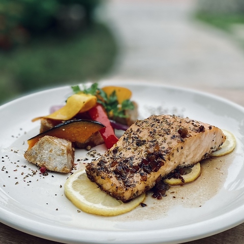 肉厚でジューシー!オープン以来人気のふっくらサーモンのグリル。レモンバターソースで。