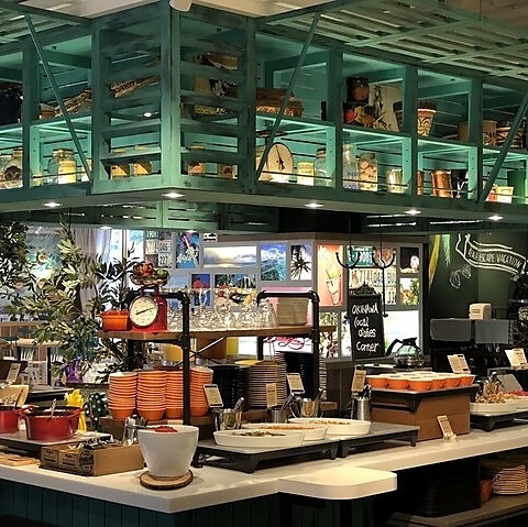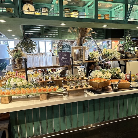 【ビュッフェコーナー】朝食ビュッフェとランチのハーフビュッフェで所狭しと料理が並ぶ自慢のコーナーです◎日替わりの焼きたてパンや新鮮な野菜を使ったサラダバー、体に優しいスープやデトックスウォーター、デザートまでご用意してます☆
