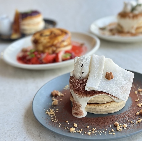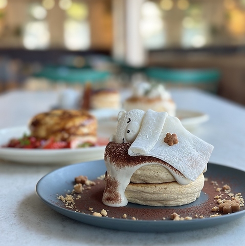味はもちろん視覚でも楽しめるアリーズのカフェメニュー♪見た目も可愛いらしい「居眠りベアシリーズ」は当店おすすめの一品!ふんわりと焼き上げたパンケーキや、とろけるように濃厚なバスクチーズケーキも人気です。種類豊富なドリンクバーもご用意しております★