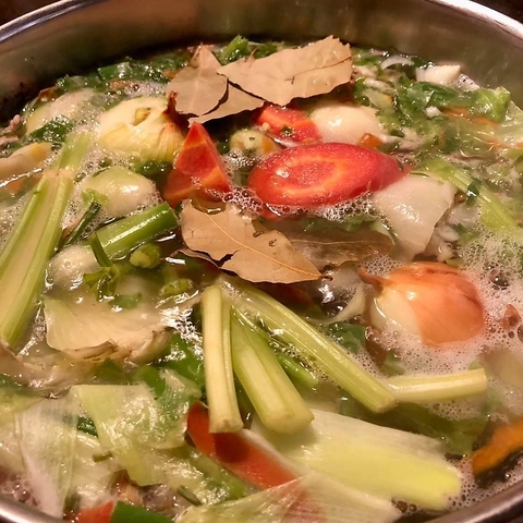 当店では香味野菜、鶏ガラ、魚介類をじっくり炒めて数時間煮込み、琥珀色のスープを作っています。パエリアは勿論、その他のお料理にもこちらのスープをふんだん使用しております。旨味の凝縮したスープで作る明石蛸のパエリアは是非とも食べて頂きたいものです!