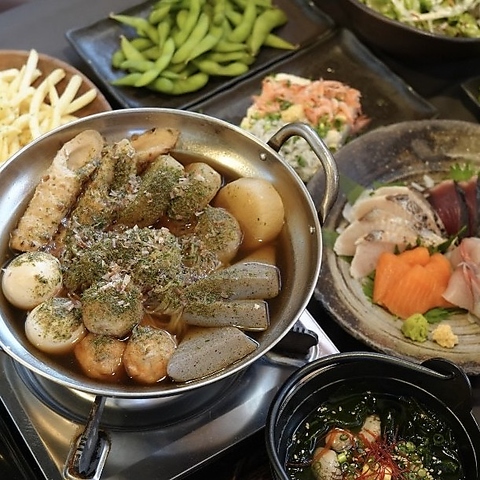 枝豆ガーリックバター醤油、 本日の厳選サラダ、本日のカルパッチョ、本日のなめろう、海鮮キムチユッケ、チーズポテト、唐揚げタルタル、あさりの酒蒸し、メインが選べる!A鉄板焼き(牛&鶏)・塩焼きそば、B鍋(鶏or豚orもつor海鮮チゲ)・雑炊orラーメン Cお刺身の盛り合わせ6種・塩焼きそば勿論デザート付!