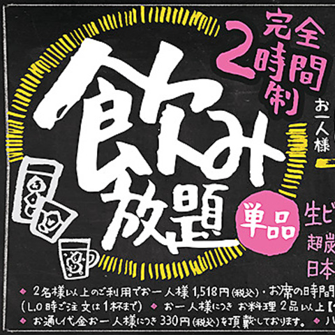 席予約でOK!2名様~お一人1380円(税込1518円)で単品飲み放題!お一人様につき2品(400円~)以上の料理注文
