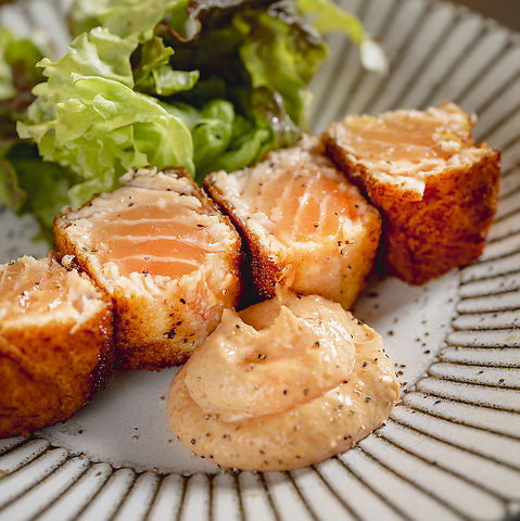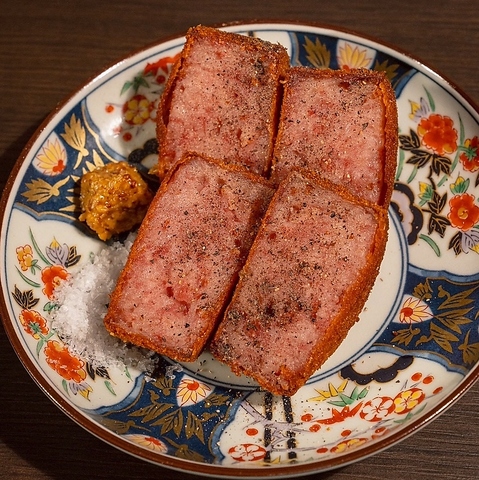 上質な牛肉を絶妙な火加減で揚げ、中心をしっとりとレアに仕上げました。サクサクの衣と肉本来の旨味が重なり合い、噛むほどに味わい深い余韻を残します。岩塩やおろしポン酢など、シンプルな薬味で素材の美味しさをじっくりお楽しみください。
