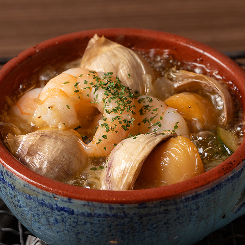 具材の旨味がたっぷり溶け出した「オイル」が醍醐味のアヒージョ。チャパタを浸して召し上がれ。