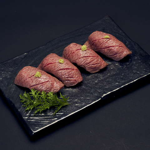 テレビにも紹介された中山亭の名物。モモ肉の中でも霜降りもしっかり入った柔らかい部位を厳選。酢飯と和牛のうまみの融合はぜひ一度食べていただきたい逸品です。