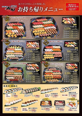 平日11~15時限定!!【1】春の旬盛りランチ1518円(込)【2】定番にぎりランチ1078円(込)【3】おすすめ鮮魚ランチ1496円(込)【4】ごちそうにぎりランチ1650円(込)【5】一日五食!まる得限定ランチ1430円(込)【6】上ネタ満腹握りランチ1540円(込)【7】特選ランチ1980円(込)