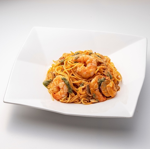 Shrimp tomato cream pasta with basil aroma comes with salad【アレルゲン Allergy】小麦/乳/えび Flour/Milk/Shrimp