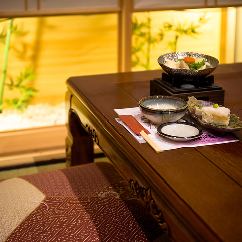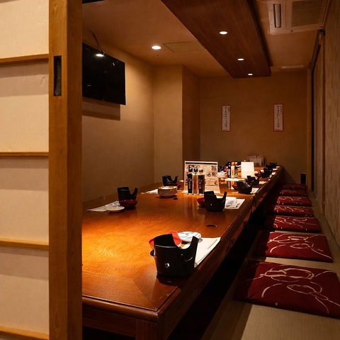 奥行きのある落ち着いた掘りごたつ個室。ゆったりとした空間で周囲を気にせずお食事を楽しめるため、接待や大切な会食にも最適です。博多の新鮮な海鮮とともに、上質なひとときをお過ごしください。