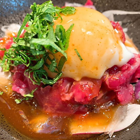 熊本出身オーナーが惚れ込む本場の桜ユッケ。鮮度抜群の馬肉を特製タレで絡め、濃厚な旨みととろける食感を実現。自信を持っておすすめする逸品です。