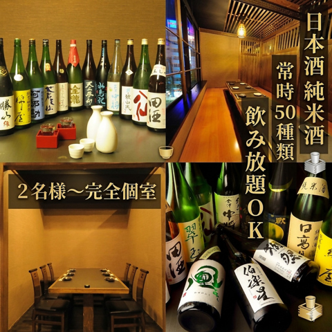 エリア最大級の日本酒飲み放題がここに!宮城だけでなく東北の日本酒(純米酒)も50種完全個室で楽しめます。