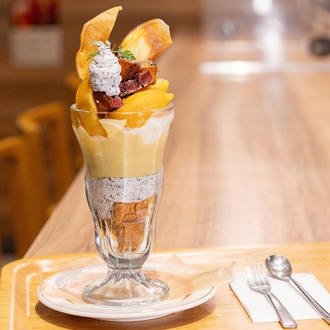 さつまいもパフェスタートしました♪「蜜芋」と呼ばれる、焼き芋にすると糖度が50度以上にもなる "紅はるか"を指定農家さんから等級や規格を厳選して使用しています。今年は、りんごのキャラメリゼを合わせていて、ほろ苦さも甘じょっぱさも楽しめます。中身はスイートポテトや大学いも、黒ゴマクリームなどなど…食べ進める変化の違いや発見を今回もお楽しみください♪芋好きの方はお早めに。※パフェの提供は14時~となります。