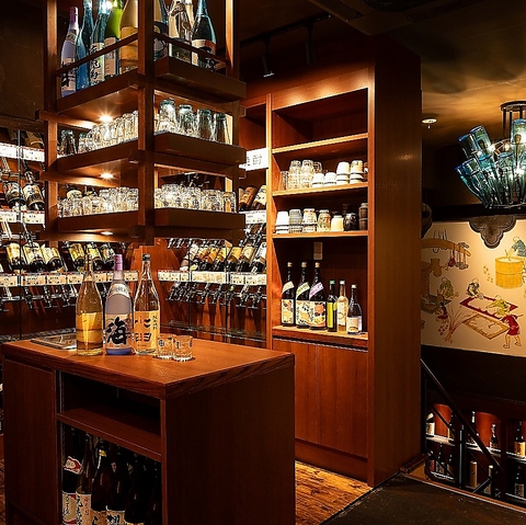 【焼酎100種以上】隙間なくぎっしりと並んだ焼酎の数々は、焼酎好きのお客様も驚くほど豊富な種類