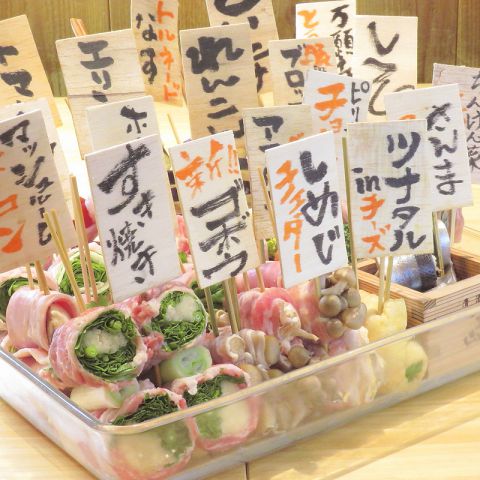 常時20~30種の串巻き料理をご用意!春夏秋冬、季節の野菜を肉で巻いた大人気の定番料理です!仕入れ状況により、野菜は入れ替わりますので、お問い合わせください!定番の野菜巻き串から変わり種まで、店主こだわりの野菜串巻を、ぜひぜひご堪能下さい♪