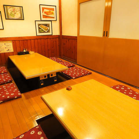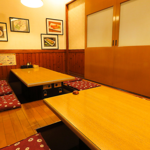 掘りごたつ席は、居心地の良い空間でくつろぎながらお食事を楽しむのに最適です。周囲の目を気にせず、家族や友人と楽しい会話を交わしながら、心温まるひとときをお過ごしいただけます。お子様連れのお客様にも安心してご利用いただけるよう、広々としたスペースが確保されており、リラックスできる環境が整っています。