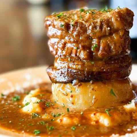 今回のスペシャリテは『豚肩ロースのビール煮込み こだわりローストオニオンと大根のボッリート』です