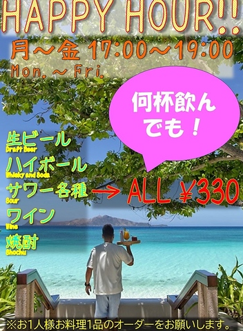 | 利用条件 | 各種コース料理ご注文で2時間飲み放題、お2人様よりご利用いただけます。 |