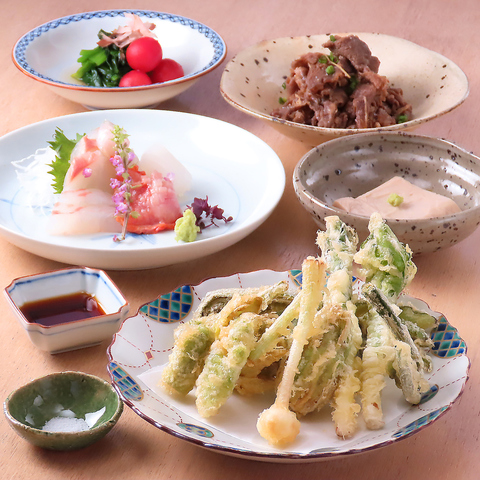 当店のコースは四季折々の食材に腕を振るい、さまざまな料理で皆様をおもてなしいたします。一皿一皿を熟練の技で、丁寧に仕上げたコースは 大切なお客様の接待・商談にオススメです。「和」の枠組みにとらわれず、和風をベースに 料理人のオリジナル性が溢れる料理をご提供しております。