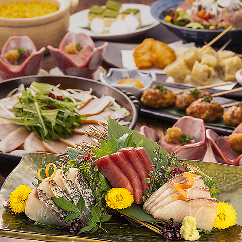 【筑(つくし)コース】お造り3種盛り合わせ、阿波尾鶏のつくね串、国産牛もつ鍋など旬の味覚とこだわり料理の数々。+300円(税込)で地酒や焼酎も飲み放題の特選飲み放題にグレードアップできます♪