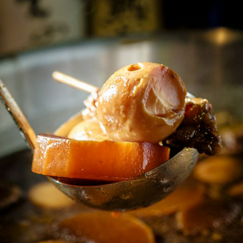 北九州で愛されている伝統的な味噌おでん「どぶ炊き」は、3種盛り合わせ、5種盛り合わせ、牛すじ、大根、たまご、串カツ、ちくわ、ハムカツでご用意しております。しっかり煮込まれ、味の染みた大根は格別です。もちろんお酒は九州のもの中心でご用意しておりますので、是非ご一緒にお召し上がりください。